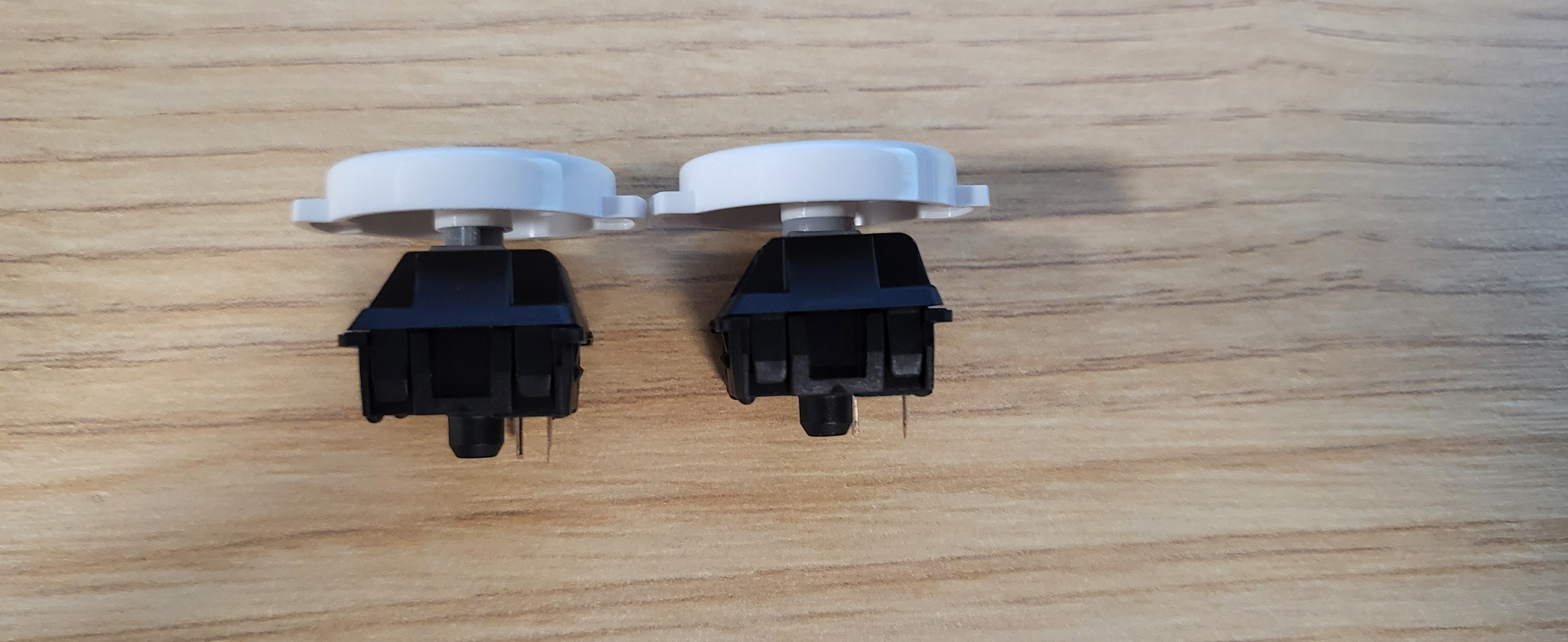 좌측은 1mm 플라스틱 와셔를 2개 장착한 흑축, 우측은 와셔를 제거한 은축이며 높이의 차이가 많이 납니다.