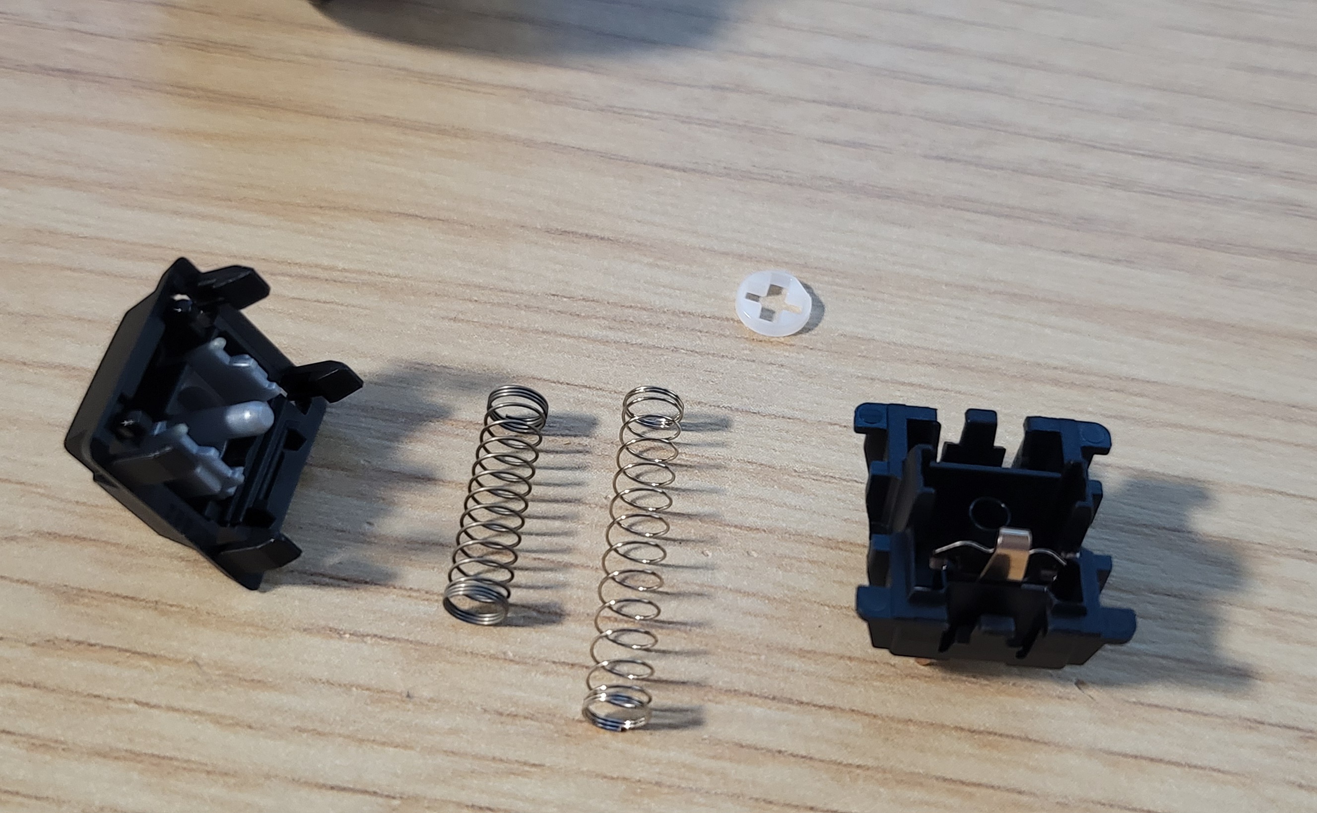 체리 은축 스위치가 장착되어 있으며 스위치 십자부분에 오링 같은 플라스틱 와셔가 있습니다.